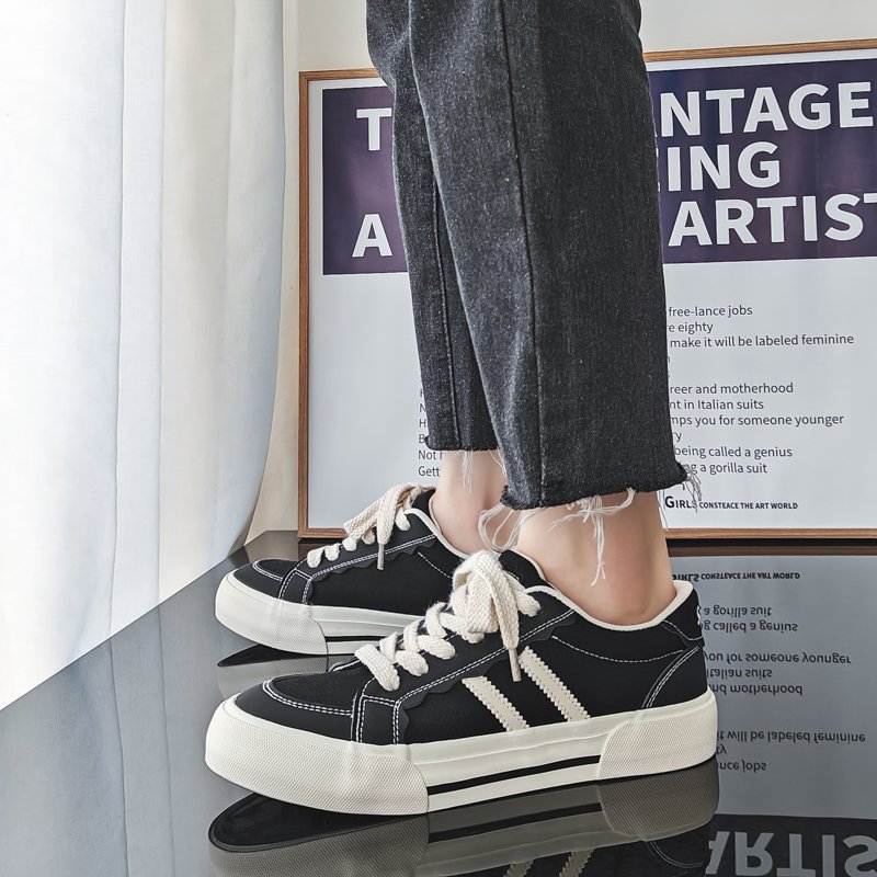 These classic black and white canvas shoes feature a sleek black base with white stripe accents, delivering a stylish and understated retro vibe. Crafted with high-quality canvas material, they are breathable, durable, and comfortable for long-term wear. The soft insole and thick rubber outsole provide excellent cushioning and anti-slip performance, ensuring stability and comfort all day. With their versatile design and timeless color combination, these shoes are perfect for daily commutes, casual outings, or trendy streetwear looks.