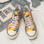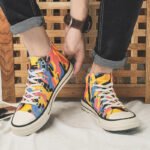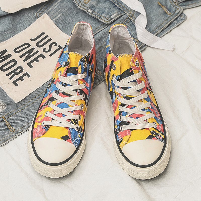 This pair of high-top canvas shoes features a vibrant color-block camouflage design, perfectly combining style and comfort. Made with premium canvas, the upper is breathable and durable, ensuring all-day comfort. The rubber sole offers excellent slip resistance, making it suitable for both daily wear and outdoor activities. The bright colors and unique patterns add a pop of style, ideal for consumers seeking a personalized look. These canvas shoes pair effortlessly with jeans, shorts, or skirts, showcasing a trendy and distinctive charm, making them an excellent choice for your everyday outfits.