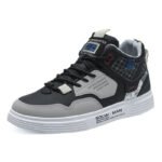 These trendy high-top sports casual sneakers feature a black and grey color scheme with modern lettering and geometric patterns, perfectly showcasing a sleek, urban style. The premium synthetic leather upper is durable, easy to clean, and designed for everyday wear. The soft, breathable lining and cushioned insoles ensure maximum comfort, even during extended walks or activities. The anti-slip rubber sole delivers excellent traction and durability, providing stability with every step. Branding and 3D detailing on the sides add a bold and fashionable touch, making these sneakers a must-have for trendsetters.