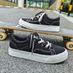 These black low-top canvas shoes feature a timeless minimalist design with a black upper accented by white stitching and laces, making them effortlessly stylish and versatile. Made with high-quality canvas material, they are soft, breathable, and paired with a durable anti-slip rubber sole for lasting comfort and reliability. Perfect for daily wear, campus life, or casual outings.