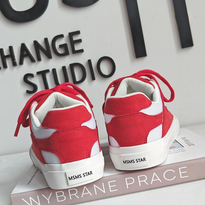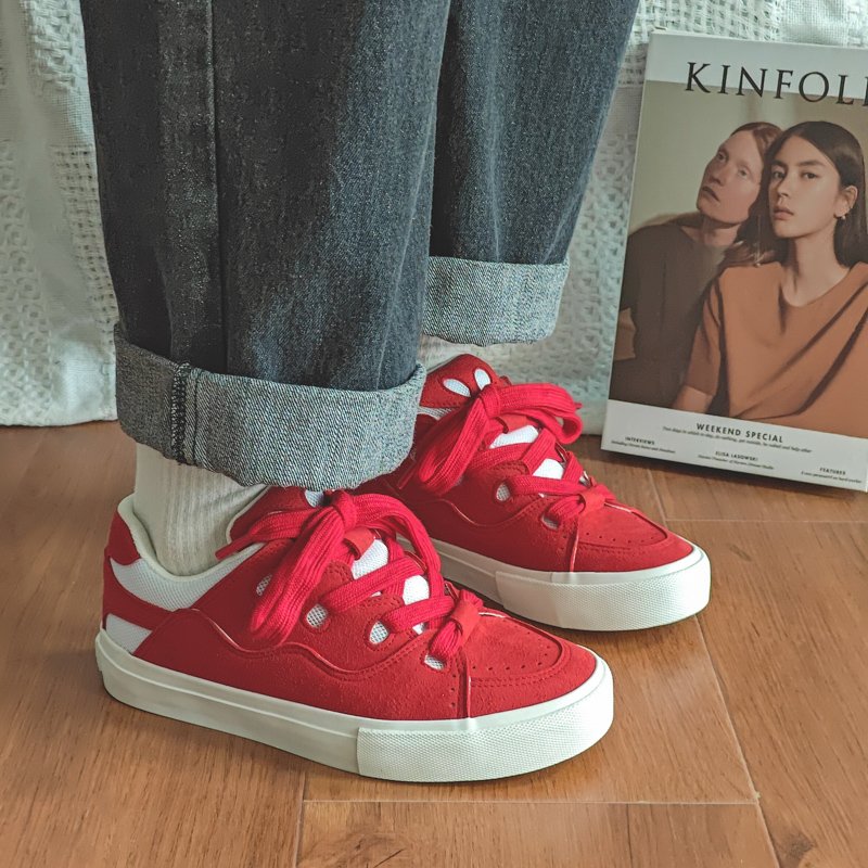 These red sporty canvas shoes perfectly blend energy and style, designed for those who value fashion and comfort. The upper combines premium suede and mesh materials, offering a soft touch and breathable comfort for all-day wear. The vibrant red color paired with wide laces adds a bold, standout look, ensuring you make a statement wherever you go. The anti-slip, wear-resistant rubber sole provides excellent traction and stability, making them suitable for casual outings, workouts, or streetwear styling. Whether paired with jeans, sportswear, or trendy street fashion, these canvas shoes are the perfect highlight for your outfit.